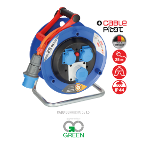 – Cabo preto de 15 metros (utilização em estaleiro e utilização permanente no exterior, IP54, tomadas com tampas de fecho automático).