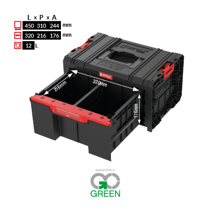 A Qbrick System PRO Drawer 1 Toolbox 2.0 Basic é uma caixa de ferramentas modulares e espaçosa equipada com um puller pull-out de uma capa. Botão que fornece fácil acesso ao seu conteúdo. A gaveta é equipada com 1 partição, que pode ser colocada em três lugares dedicados. Corpo da gaveta feito de plástico ABS.