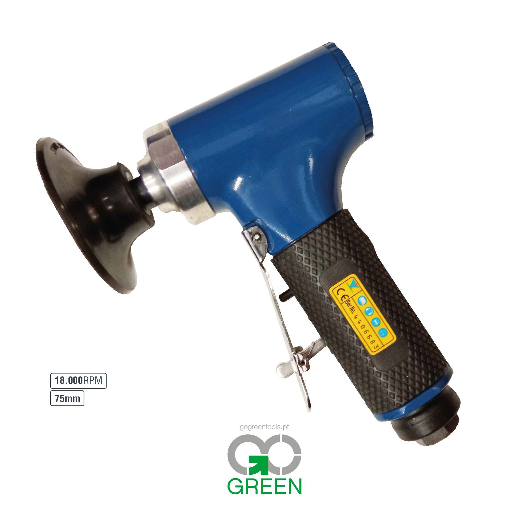 Lixadeira com prato 3″ (75mm), 18.000rpm, 0.80Kg, consumo 84 l/min. Inclui 30 lixas de grão 60, 80 e 100 e 3 discos surface-conditioning.